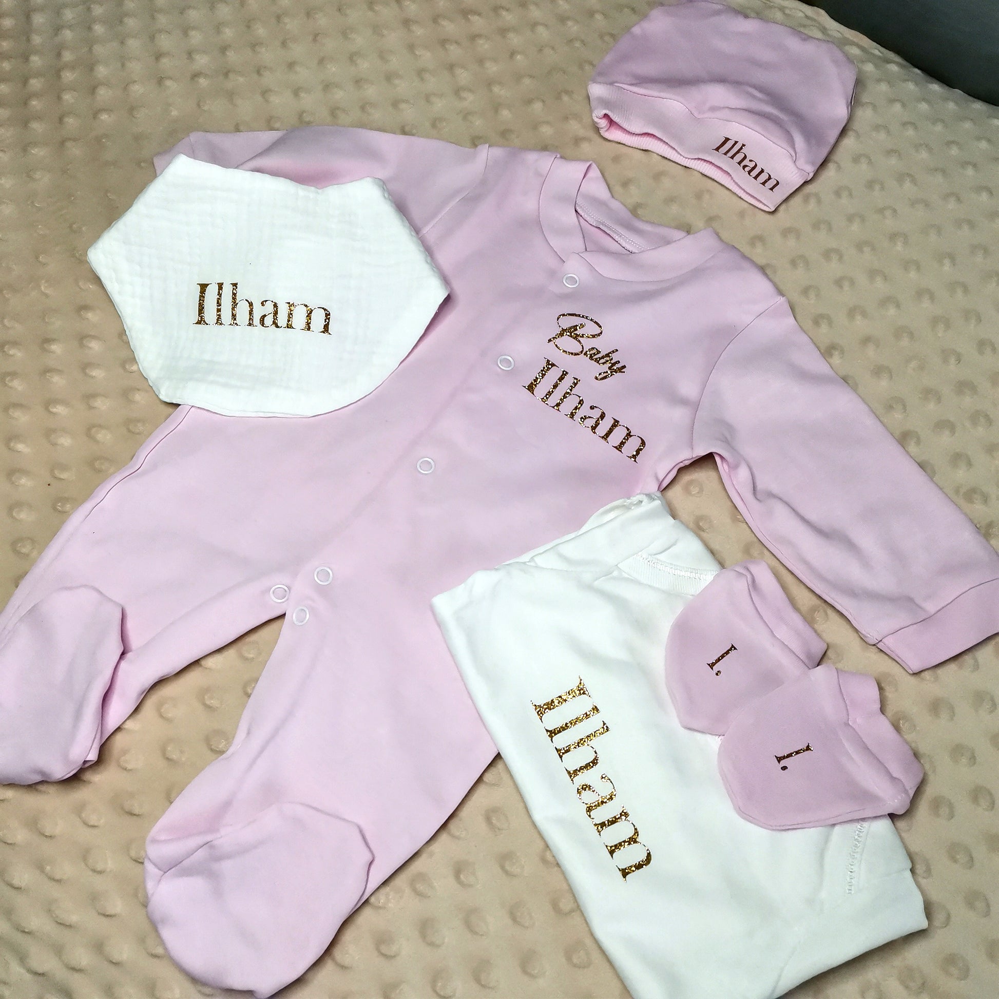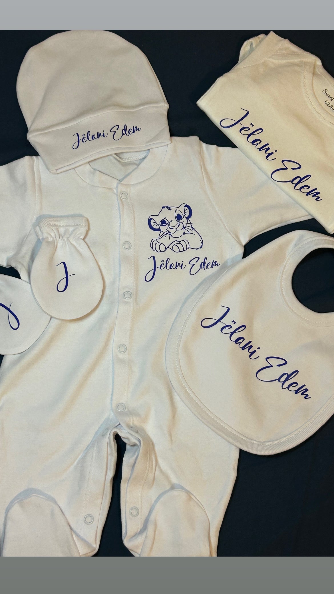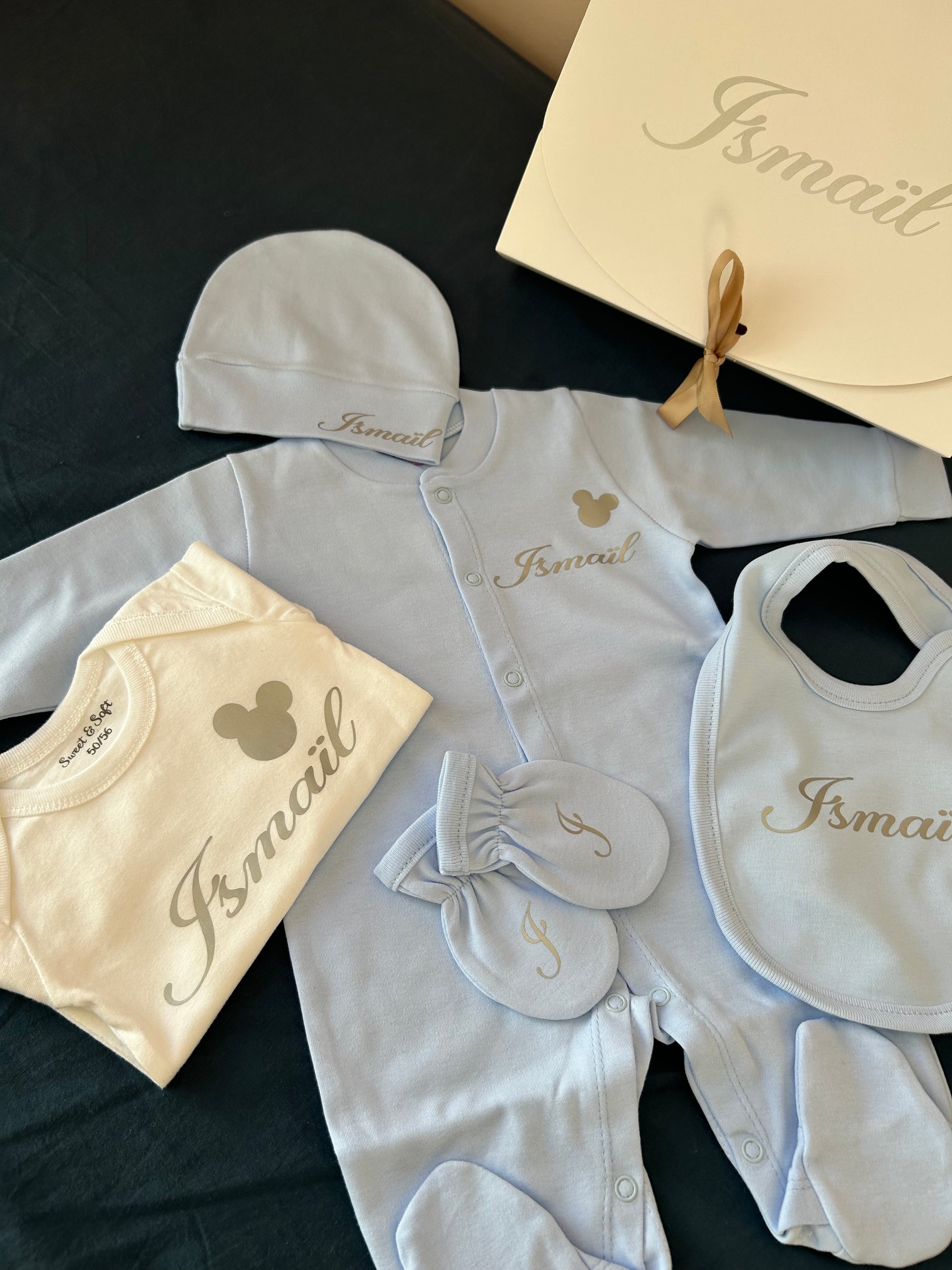 Chaque coffret contient un pyjama, un body, un bavoir, un bonnet et des moufles, présentés dans une jolie boîte personnalisée au prénom ou au mot doux de votre choix.