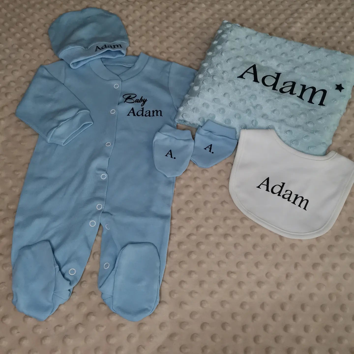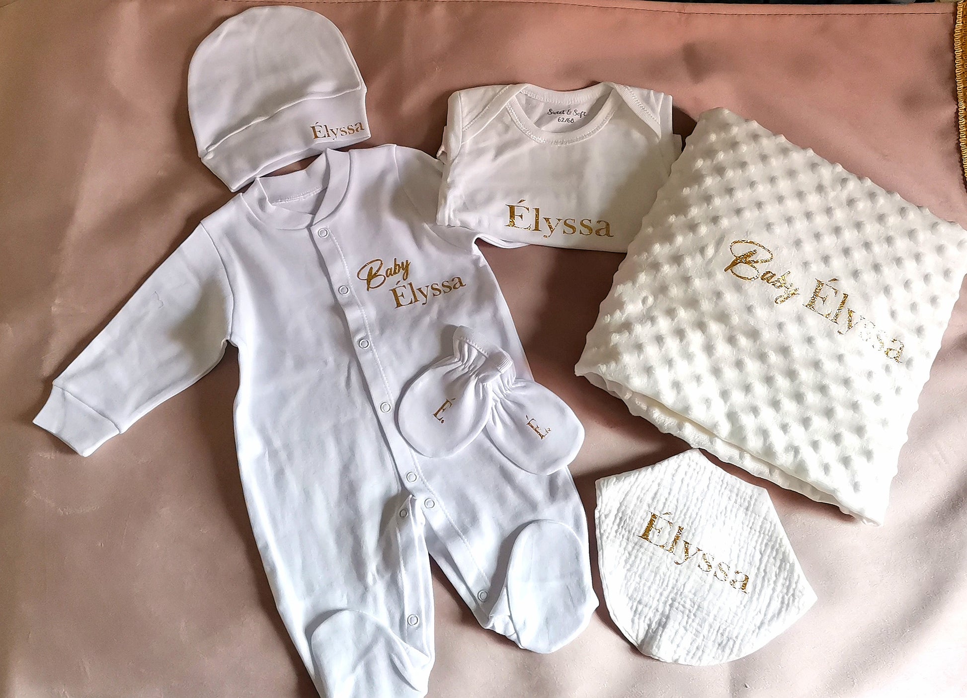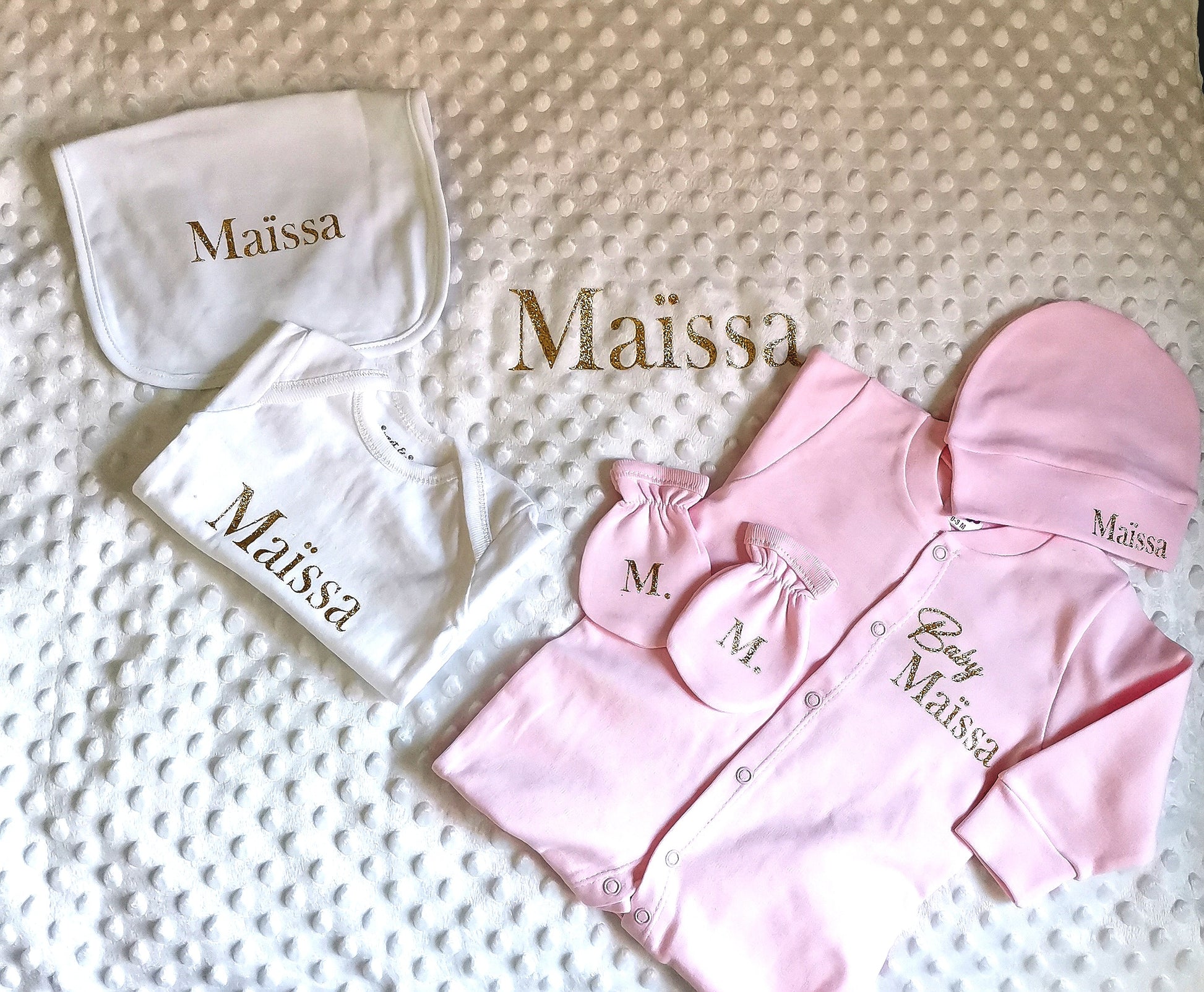 Chaque coffret contient un pyjama, un body, un bavoir, un bonnet et des moufles, et une couverture présentés dans une jolie boîte personnalisée au prénom ou au mot doux de votre choix.